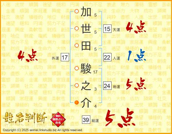 加世田駿之介さんの総運は39画の5点!