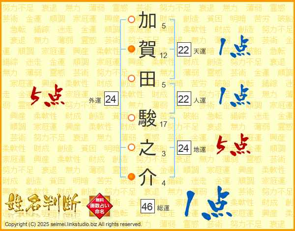 加(5画)賀(12画)田(5画) 駿(17画)之(3画)介(4画)
