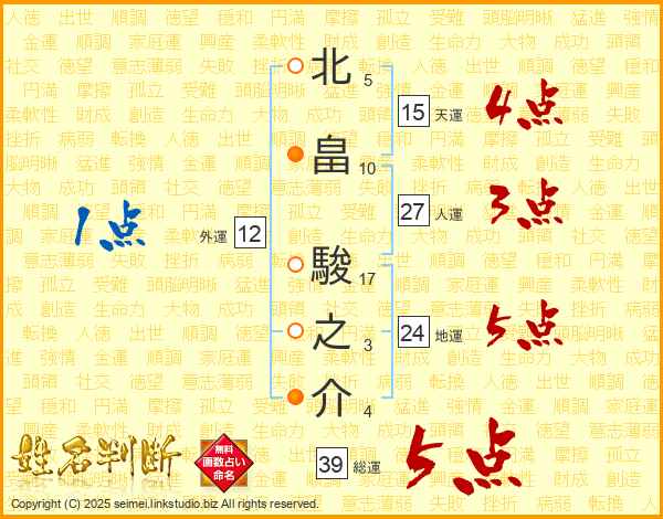 北(5画)畠(10画) 駿(17画)之(3画)介(4画)