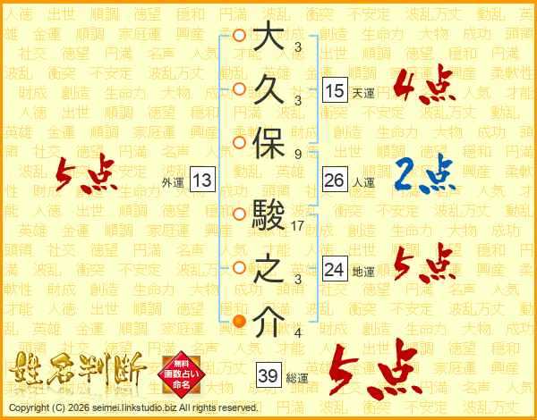 大(3画)久(3画)保(9画) 駿(17画)之(3画)介(4画)