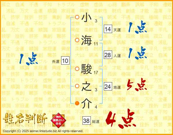 小(3画)海(11画) 駿(17画)之(3画)介(4画)