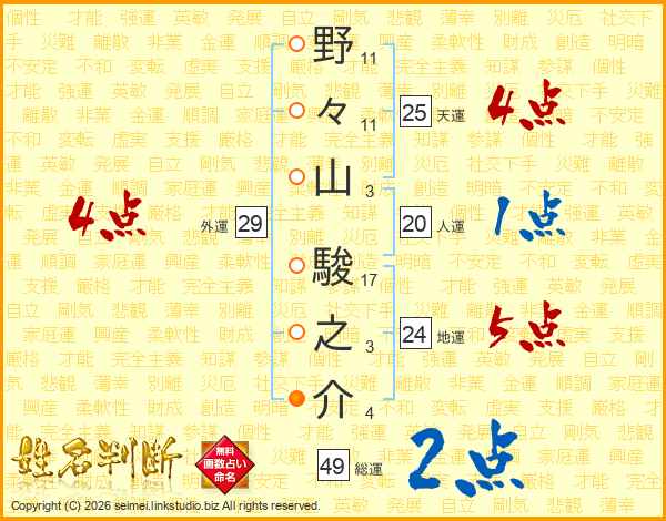 野(11画)々(11画)山(3画) 駿(17画)之(3画)介(4画)
