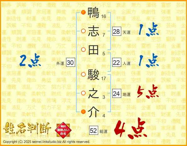 鴨(16画)志(7画)田(5画) 駿(17画)之(3画)介(4画)