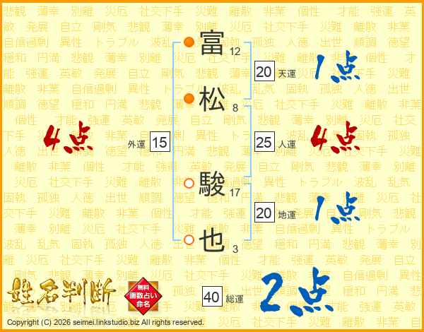 生活面を象徴する運勢です。外部から受ける影響力を表し、結婚運、家庭運や職場、環境への順応性を表します。総運から人運を引いた画数。姓や名が1文字の場合を除く。
