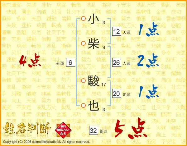 生活面を象徴する運勢です。外部から受ける影響力を表し、結婚運、家庭運や職場、環境への順応性を表します。総運から人運を引いた画数。姓や名が1文字の場合を除く。