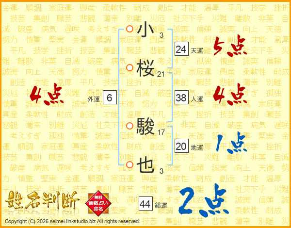 小桜駿也さんの総運は44画の2点!