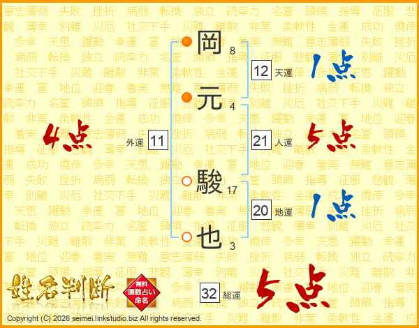 岡元駿也さんの総運は32画の5点!