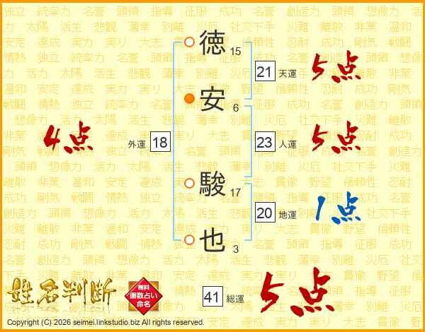 徳安駿也さんの総運は41画の5点!