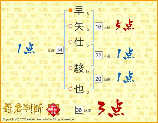 早(6画)矢(5画)仕(5画) 駿(17画)也(3画)