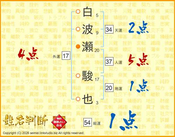 白(5画)波(9画)瀬(20画) 駿(17画)也(3画)