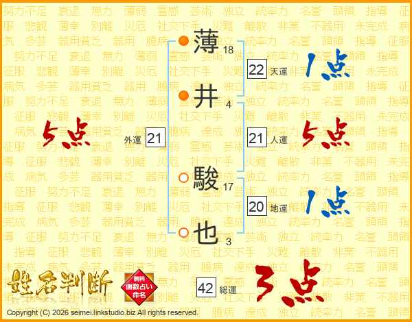 薄井駿也さんの人運は21画の5点!