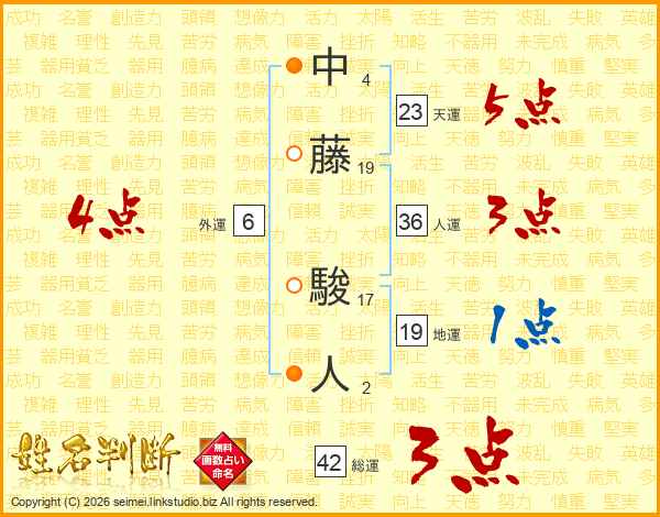 あなたの人生を表す1番重要な運勢です。生涯を通じて影響する総合運となり、主に50歳以降の晩年期に影響を及ぼします。苗字と名前の合計画数。