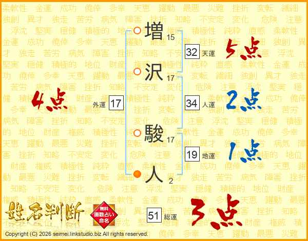 増(15画)沢(17画) 駿(17画)人(2画)