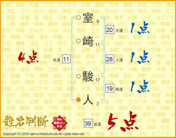 生活面を象徴する運勢です。外部から受ける影響力を表し、結婚運、家庭運や職場、環境への順応性を表します。総運から人運を引いた画数。姓や名が1文字の場合を除く。