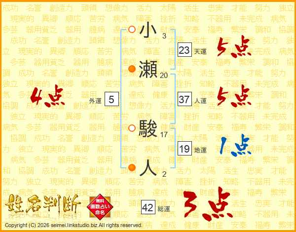 小(3画)瀬(20画) 駿(17画)人(2画)