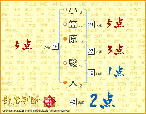 小笠原駿人さんの総運は43画の2点!