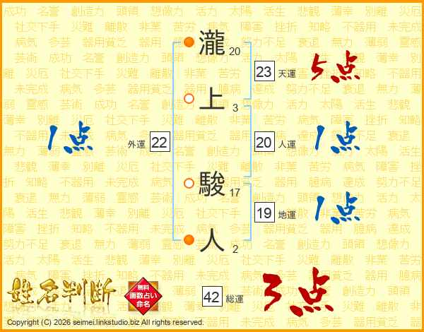 瀧上駿人さんの天運は23画の5点!