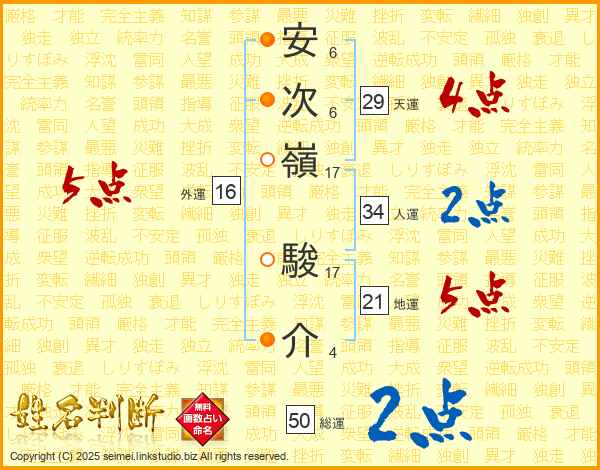 安(6画)次(6画)嶺(17画) 駿(17画)介(4画)