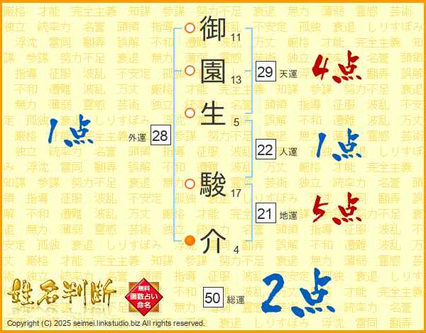 御(11画)園(13画)生(5画) 駿(17画)介(4画)