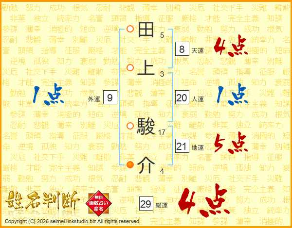 生活面を象徴する運勢です。外部から受ける影響力を表し、結婚運、家庭運や職場、環境への順応性を表します。総運から人運を引いた画数。姓や名が1文字の場合を除く。