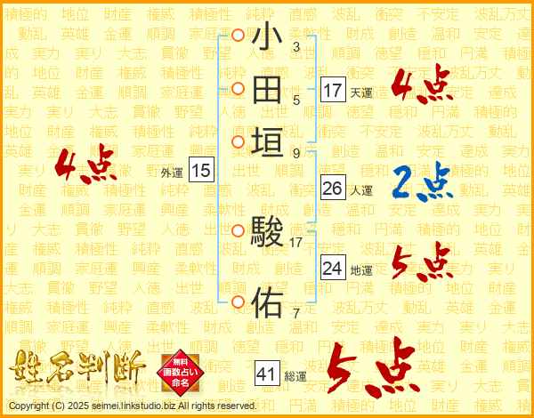 小(3画)田(5画)垣(9画) 駿(17画)佑(7画)