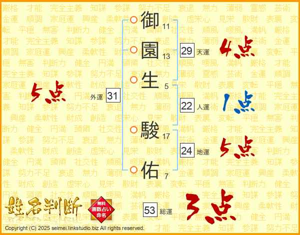 御園生駿佑さんの総運は53画の3点!