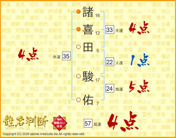 諸(16画)喜(12画)田(5画) 駿(17画)佑(7画)