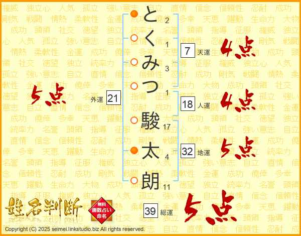 と(2画)く(1画)み(3画)つ(1画) 駿(17画)太(4画)朗(11画)
