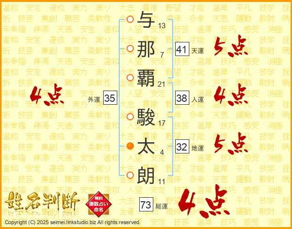 与(13画)那(7画)覇(21画) 駿(17画)太(4画)朗(11画)