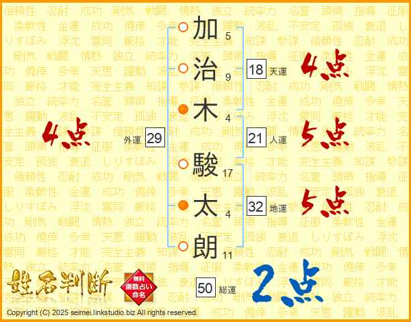 加(5画)治(9画)木(4画) 駿(17画)太(4画)朗(11画)