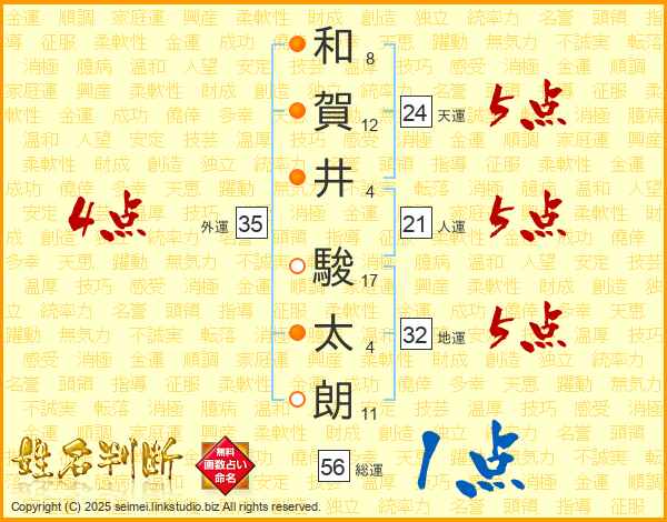 和(8画)賀(12画)井(4画) 駿(17画)太(4画)朗(11画)