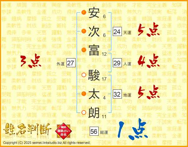 安(6画)次(6画)富(12画) 駿(17画)太(4画)朗(11画)