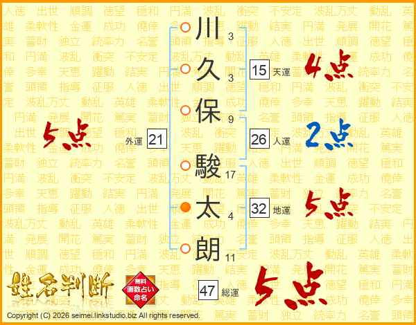 川(3画)久(3画)保(9画) 駿(17画)太(4画)朗(11画)