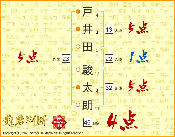 戸(4画)井(4画)田(5画) 駿(17画)太(4画)朗(11画)