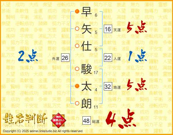 早(6画)矢(5画)仕(5画) 駿(17画)太(4画)朗(11画)