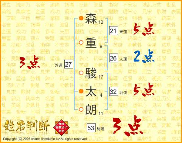 森(12画)重(9画) 駿(17画)太(4画)朗(11画)