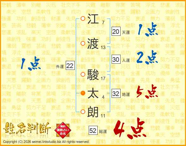 江(7画)渡(13画) 駿(17画)太(4画)朗(11画)