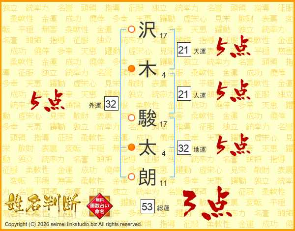 沢(17画)木(4画) 駿(17画)太(4画)朗(11画)
