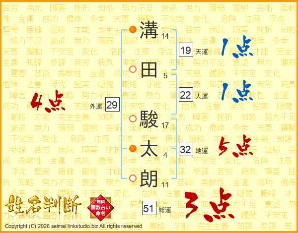 溝(14画)田(5画) 駿(17画)太(4画)朗(11画)