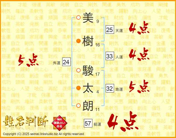 美(9画)樹(16画) 駿(17画)太(4画)朗(11画)
