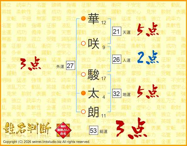 華(12画)咲(9画) 駿(17画)太(4画)朗(11画)