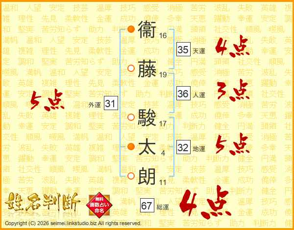 衞(16画)藤(19画) 駿(17画)太(4画)朗(11画)