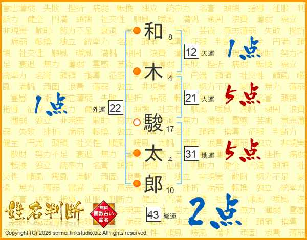 和(8画)木(4画) 駿(17画)太(4画)郎(10画)