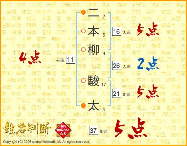 二本柳駿太さんの総運は37画の5点!