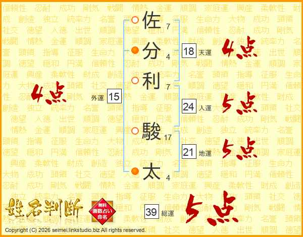 佐(7画)分(4画)利(7画) 駿(17画)太(4画)