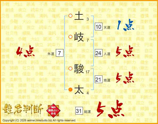 生活面を象徴する運勢です。外部から受ける影響力を表し、結婚運、家庭運や職場、環境への順応性を表します。総運から人運を引いた画数。姓や名が1文字の場合を除く。
