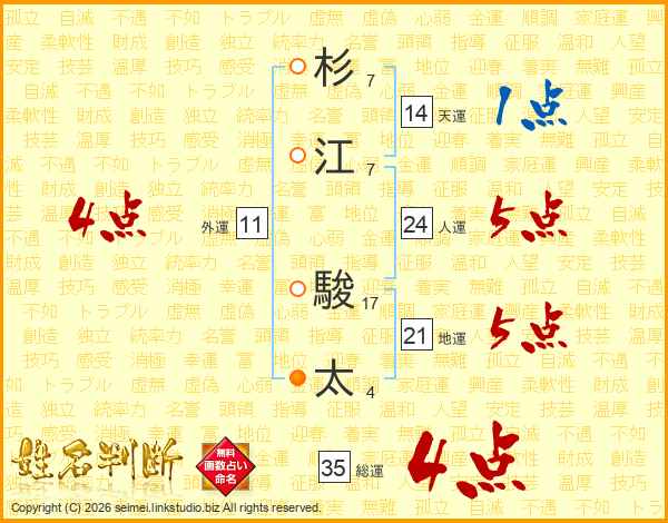杉(7画)江(7画) 駿(17画)太(4画)