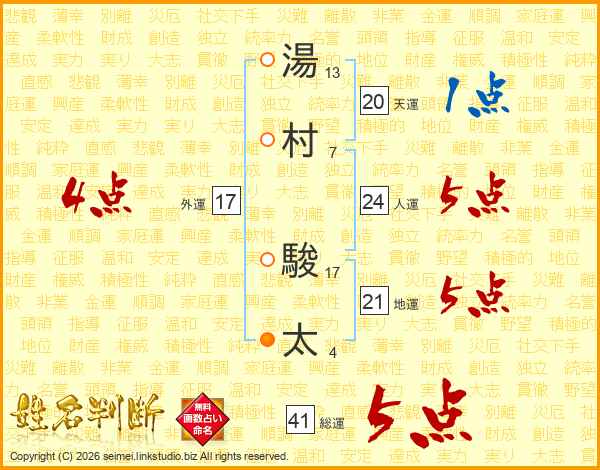 湯(13画)村(7画) 駿(17画)太(4画)