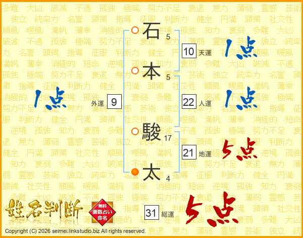 あなたの人生を表す1番重要な運勢です。生涯を通じて影響する総合運となり、主に50歳以降の晩年期に影響を及ぼします。苗字と名前の合計画数。