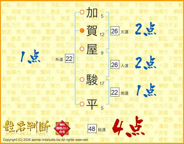 加(5画)賀(12画)屋(9画) 駿(17画)平(5画)